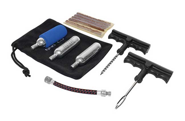 Kit reparatie anvelopa Bronco. Kitul contine: 5 snururi anvelope 4", 3 cartuse de CO2, 2 unelte pentru snur - una spiralata pentru pregatirea perforatiei si una pentru aplicare snur de vulcanizare (prevazuta cu urechi speciale) si geanta pentru transport logo Bronco, dimensiuni 125 x 185 mm.