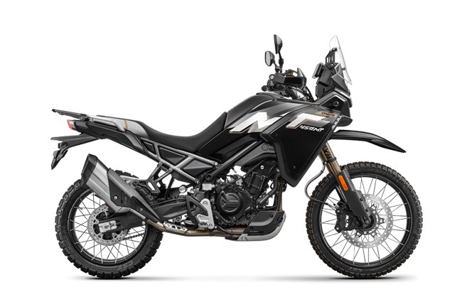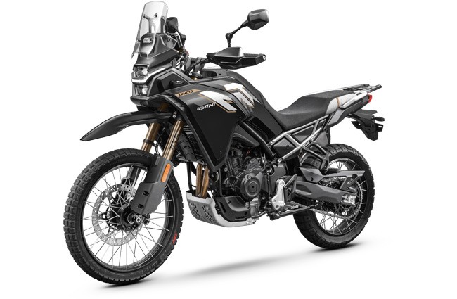 CFMOTO 450MT este o motocicletă adventure din segmentul mediu, concepută pentru riderii care doresc versatilitate atât pe asfalt, cât și pe teren accidentat. Designul robust și carenajul inspirat din motocicletele de rally evidențiază caracterul off-road al modelului, iar ergonomia bine echilibrată oferă confort pe distanțe lungi și control excelent în trasee dificile. Motocicleta este echipată cu un motor bicilindric paralel în patru timpi, DOHC, răcit cu lichid, cu o capacitate de 449 cm³, care dezvoltă 31 kW (42 CP) la 8.500 rpm și un cuplu de 42 Nm la 6.250 rpm. Propulsorul utilizează injecție electronică Bosch EFI și este cuplat la o cutie de viteze cu 6 trepte, oferind o livrare liniară a puterii și control optim în diverse condiții de rulare. Construită pe un cadru din oțel tip double cradle, CFMOTO 450MT oferă stabilitate ridicată și rezistență în utilizarea adventure. Suspensia utilizează componente KYB, cu furcă inversată de 41 mm complet reglabilă în partea frontală și monoamortizor spate cu sistem multi-link, fiecare cu cursă de 200 mm pentru absorbția eficientă a denivelărilor. Sistemul de frânare include un disc frontal de 320 mm cu etrier J.Juan cu patru pistoane și un disc spate de 240 mm, asistate de ABS Bosch cu două canale și control al tracțiunii. Motocicleta este echipată cu roți spitate tubeless de 21 inch pe față și 18 inch pe spate, cu anvelope 90/90 R21 și 140/70 R18, configurate pentru performanță off-road. Modelul are o greutate de 185 kg în ordine de funcționare, o înălțime a șeii de 840–800 mm și o gardă la sol de 220 mm, caracteristici care îi permit să abordeze cu ușurință terenuri dificile. Rezervorul de combustibil de 17,5 litri oferă autonomie ridicată pentru călătorii lungi, iar dotările moderne includ iluminare LED, display TFT color de 5 inch și porturi USB pentru alimentarea dispozitivelor mobile. Prin combinația dintre performanța motorului bicilindric, suspensiile cu cursă lungă și tehnologia modernă, CFMOTO 450MT se poziționează ca o motocicletă adventure echilibrată, ideală pentru riderii care doresc să exploreze atât drumurile asfaltate, cât și traseele off-road.