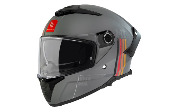 Casca integrala MT Thunder 4 SV MIL A11 cu ochelari de soare integrati. Thunder 4 SV este prima casca integrala omologata pe noul standar european de siguranta ECE 22.06. Detalii tehnice: mecanism de viziera tip MT-QVSS; calota produsa dintr-o combinatie de polimer denumita HIRP (High Impact Resistant Polymer); MT-RADD - Reduced Aero Drag Design; MT-AFCS – Air Flow Channel System – prizele de aer ale acestui model au fost concepute pentru a minimaliza rezistenta aerului si a-l canaliza in interiorul castii, reducand temperatura si umiditatea resimtite in casca in zilele calduroase; MT-EVA – Extended Vision Area – viziera asigura riderilor un camp vizual marit, crescand confortul in timpul utilizarii dar si siguranta in timpul utilizarii; MT-MDH – Micrometric Double Hook – sistemul micrometric de fixare al castii a fost regandit sa fixeze in 2 puncte, pentru o siguranta sporita; MT-UIC – Universal Intercom Cage – casca este prevazuta cu spatiu special in interiorul castii, pentru a monta sisteme de comunicatii Intercom; MT-ESP – Extended Sunvisor Protection; ERS – Emergency Release System – sistemul Quick Release permite inlaturarea rapida a partilor laterale ale interiorului castii, in caz de accident; High Quality Visor – viziera este conceputa sa asigure o rezistenta crescuta in caz de impact; Pinlock 100% max vision – viziera castii Thunder 4 SV permite instalarea unei lentile antiaburire 100% MAX Vision (camp vizual marit)