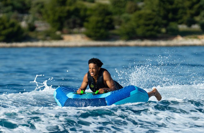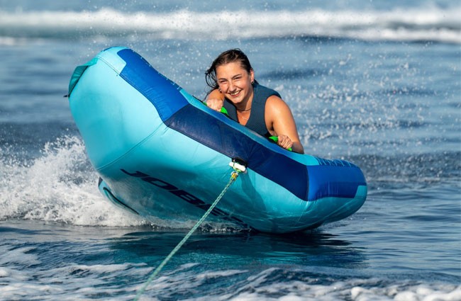 Jobe Airstream este un colac gonflabil tractabil pentru o persoană, conceput pentru adrenalina pură și distracție intensă pe apă. Compact și ușor de manevrat, acest model oferă o experiență rapidă și dinamică, permițând riderului să „zboare” efectiv peste valuri. Construcția robustă include husă din nylon 840D dublu cusut și cameră interioară din PVC de 24G, oferind rezistență superioară, durabilitate și greutate redusă, comparativ cu alte modele de pe piață. Forma bine echilibrată asigură stabilitate și senzația jucăușă, caracteristică seriei Airstream, în timp ce cele două mânere cu protecții din neopren și două mânere suplimentare din webbing oferă prindere sigură și confort pentru rider. Valva Boston unidirecțională permite umflarea rapidă, iar sistemul de conectare rapidă face atașarea la barcă simplă și sigură. Jobe Airstream Towable 1P este alegerea ideală pentru cei care caută un colac gonflabil fiabil, rezistent și extrem de distractiv, perfect pentru sesiuni intense pe lac sau mare.