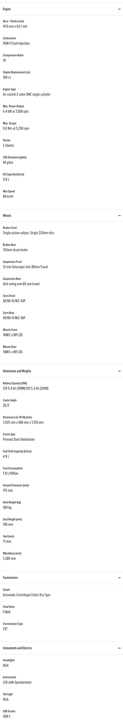 Honda Vision 110 este un scuter urban ușor, economic și fiabil, ideal pentru deplasările zilnice. Echipat cu motor de 109 cc cu injecție PGM-FI și sistem Idling Stop, oferă un consum redus de doar 1,9 l/100 km. Designul compact, șaua confortabilă și spațiul de depozitare generos îl fac ușor de manevrat în oraș. Honda Vision 110 combină stilul clasic cu tehnologia modernă pentru mobilitate eficientă și accesibilă.