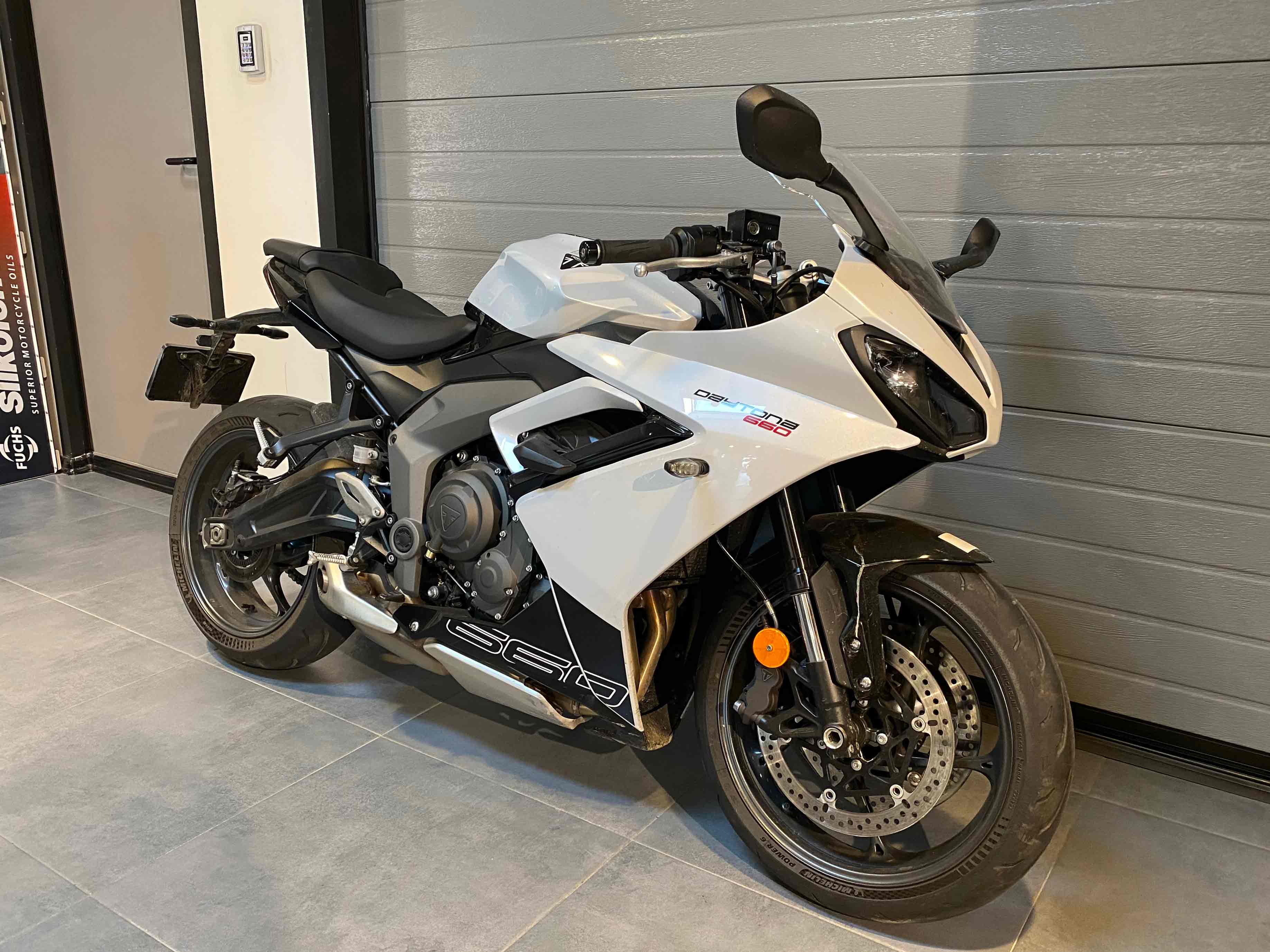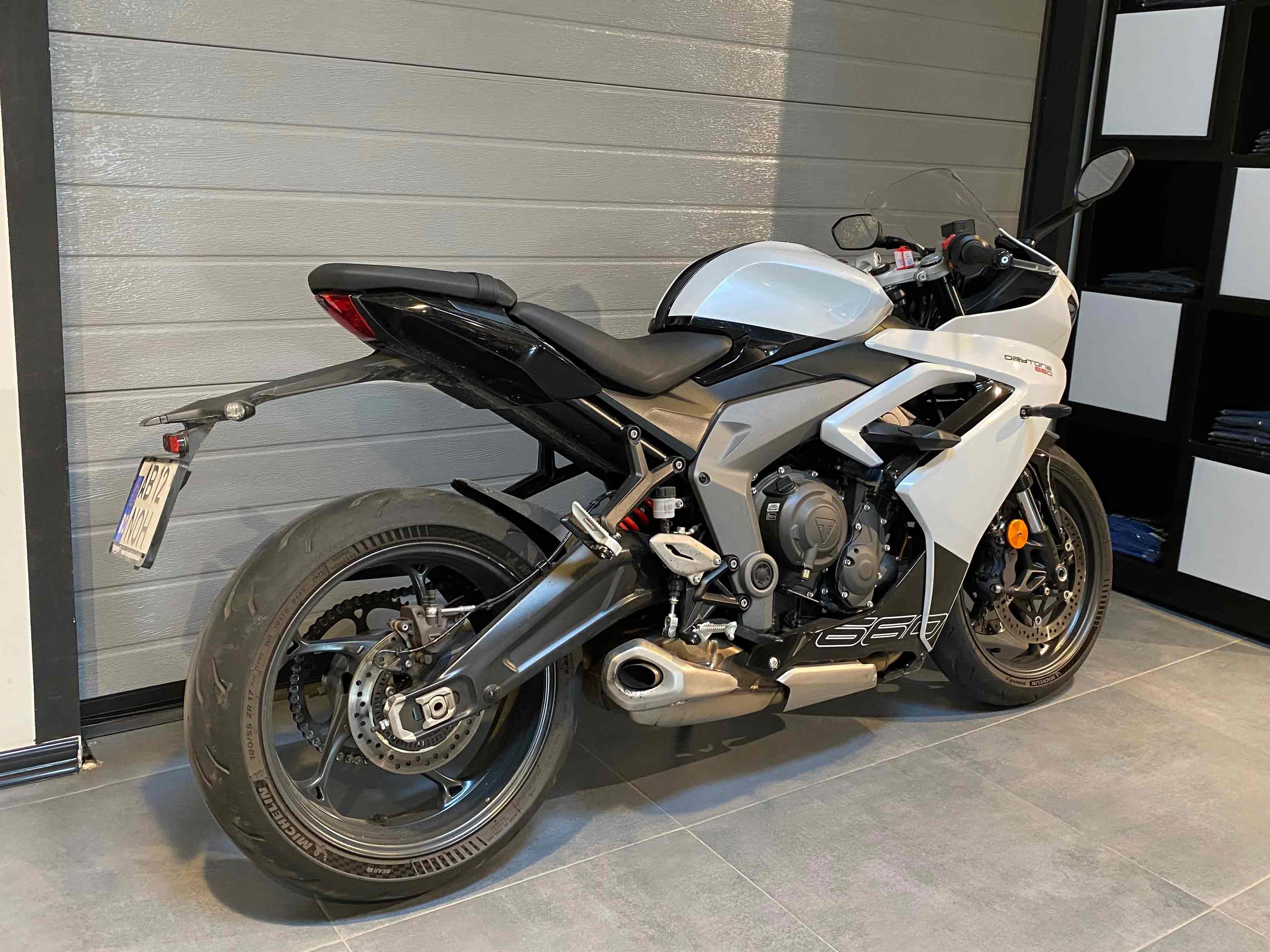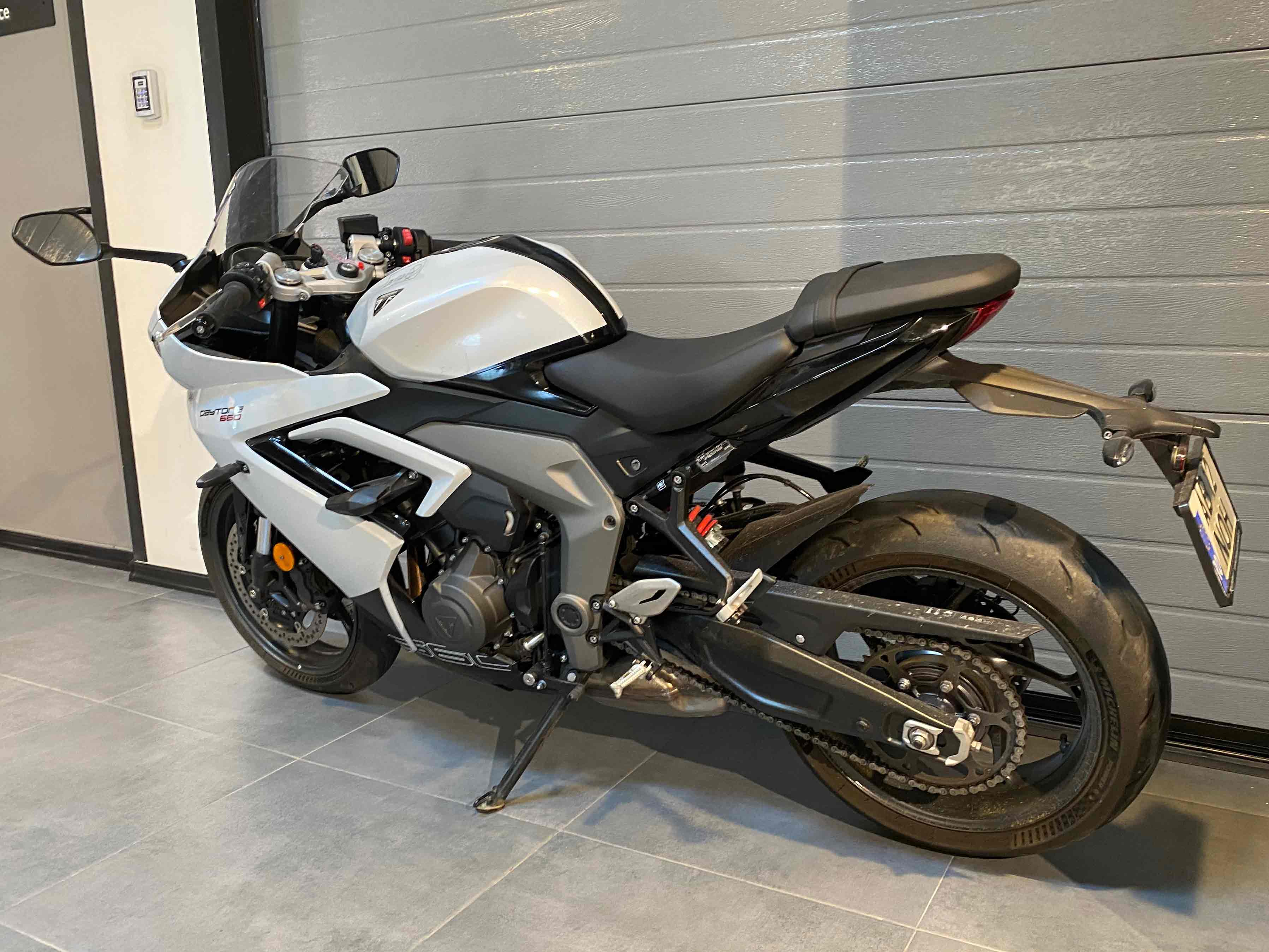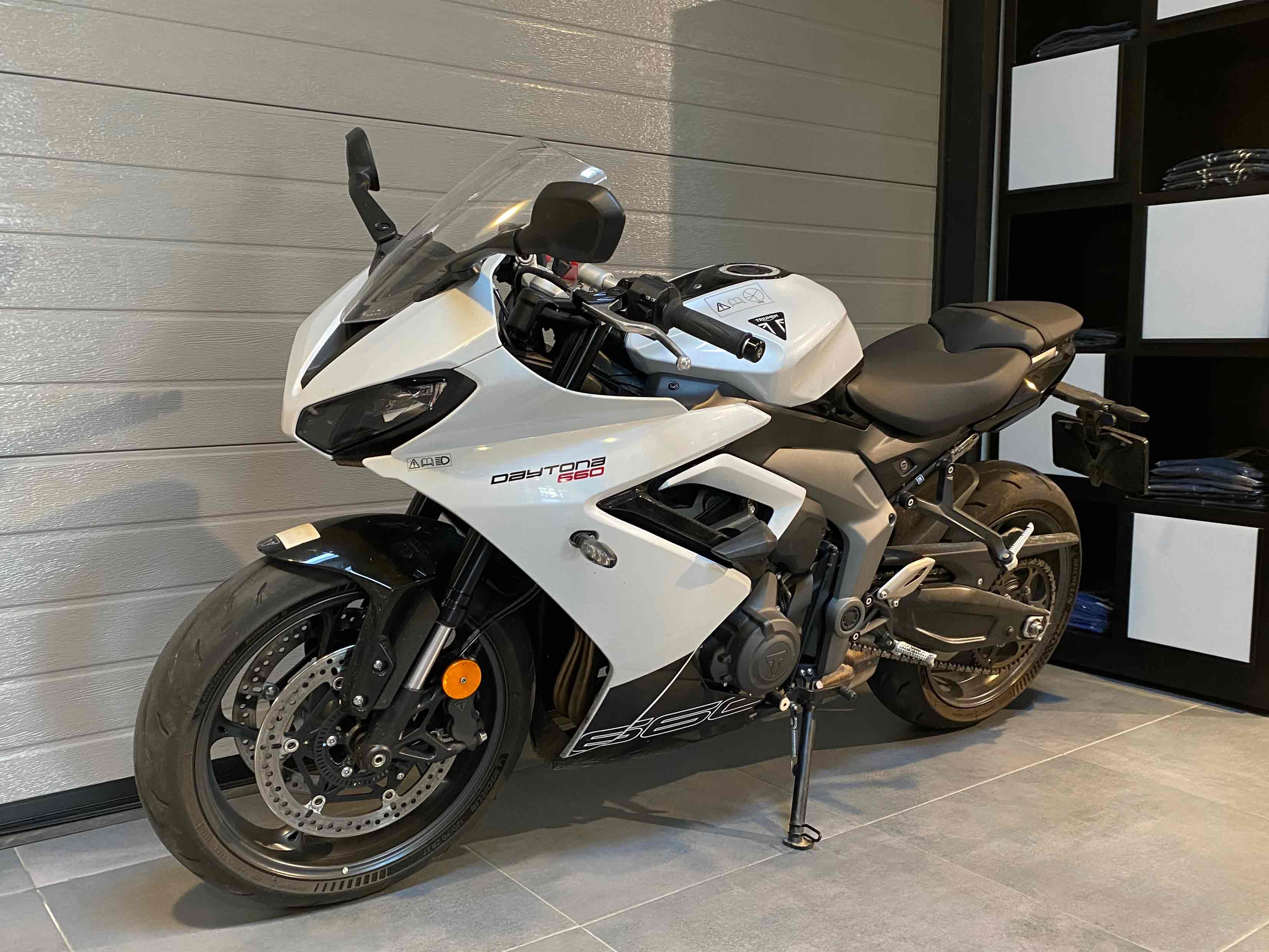 Motocicleta Triumph Daytona 660 Second, model 2024, 3.498 km, unitate demo, in stare foarte buna, fara incidente, revizii la zi. Accesorii suplimentare in valoare de 180 Eur: protectii pentru cadru, cod: A9788152. TVA-ul este deductibil.