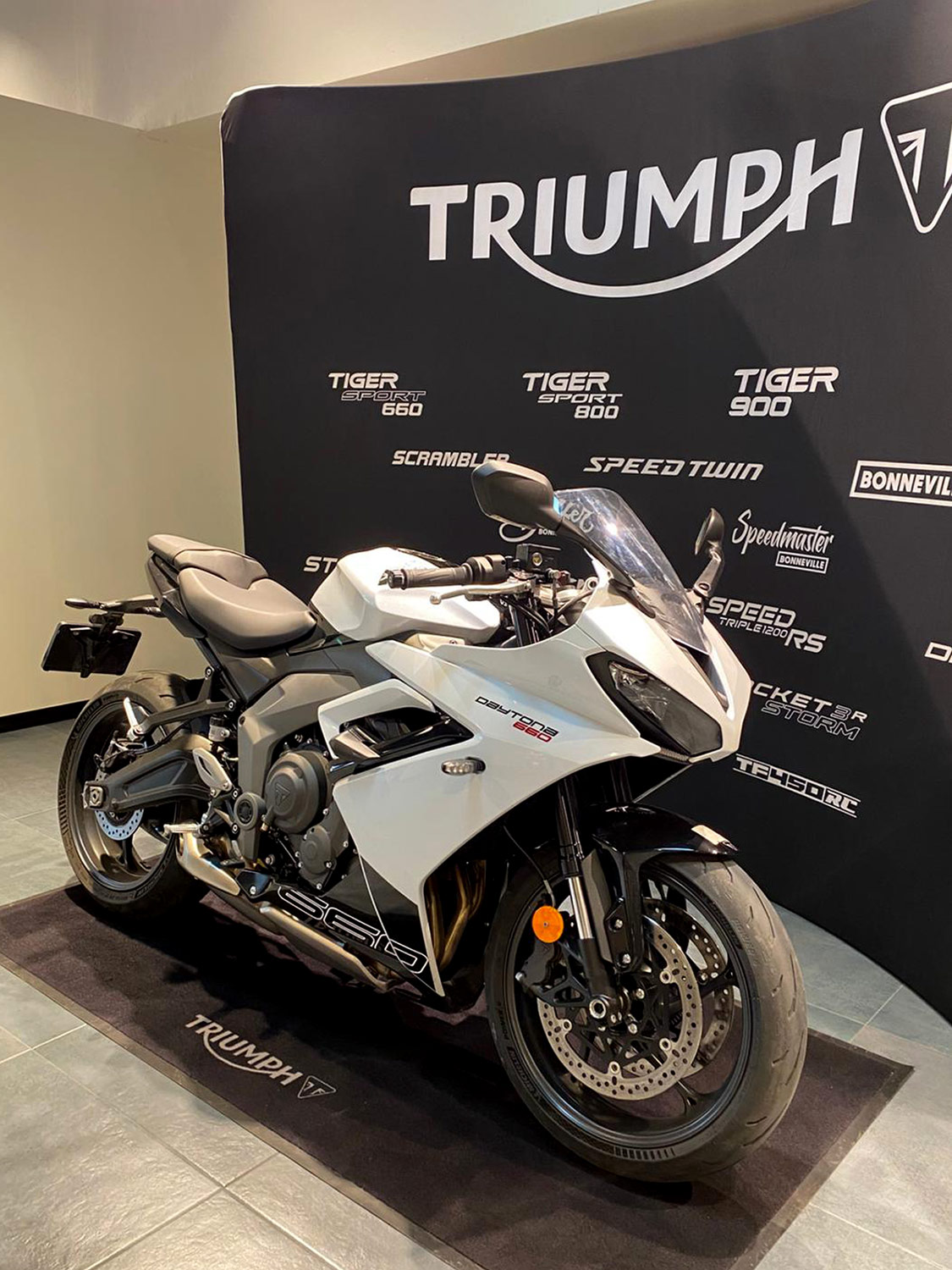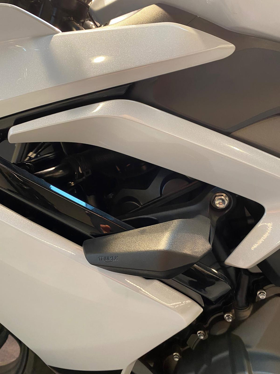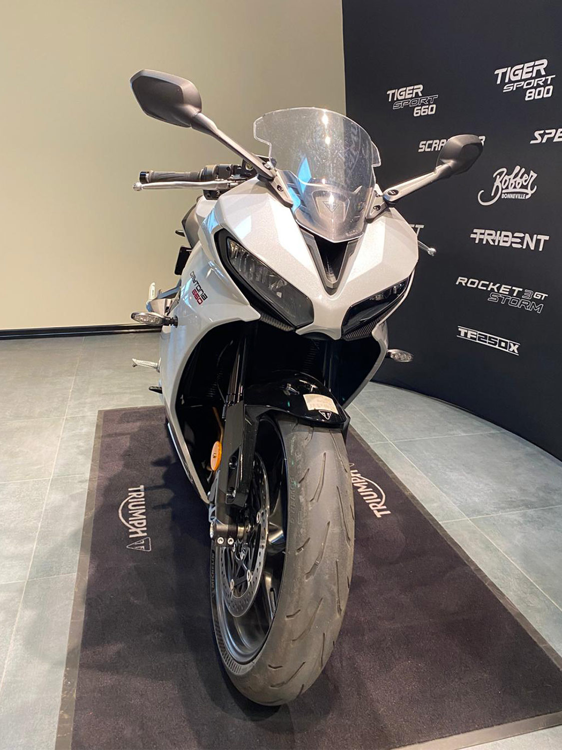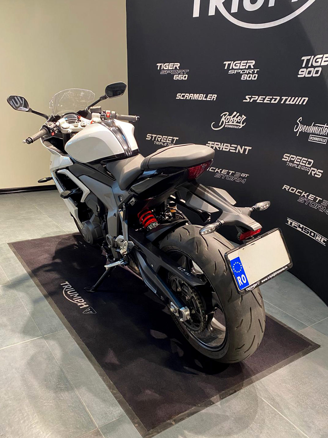 Triumph Daytona 660, model 2024, 3.689 km, unitate demo, in stare foarte buna, fara incidente, revizii la zi. Accesorii suplimentare in valoare de 180 Eur: protectii pentru cadru, cod: A9788152.