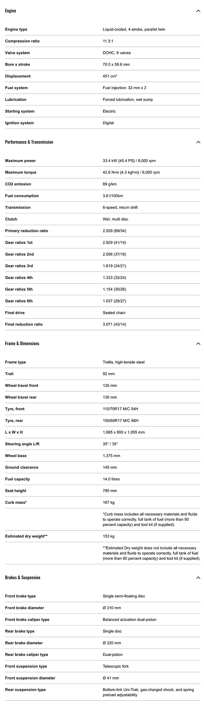 sistem ABS, sistem de alimentare prin injectie de combustibil, ambreaj Assist & Slipper, indicator pentru un condus econom, bord multi-functional cu display LCD, conectivitate cu smartphone, lumini LED, sistem Ergo-Fit