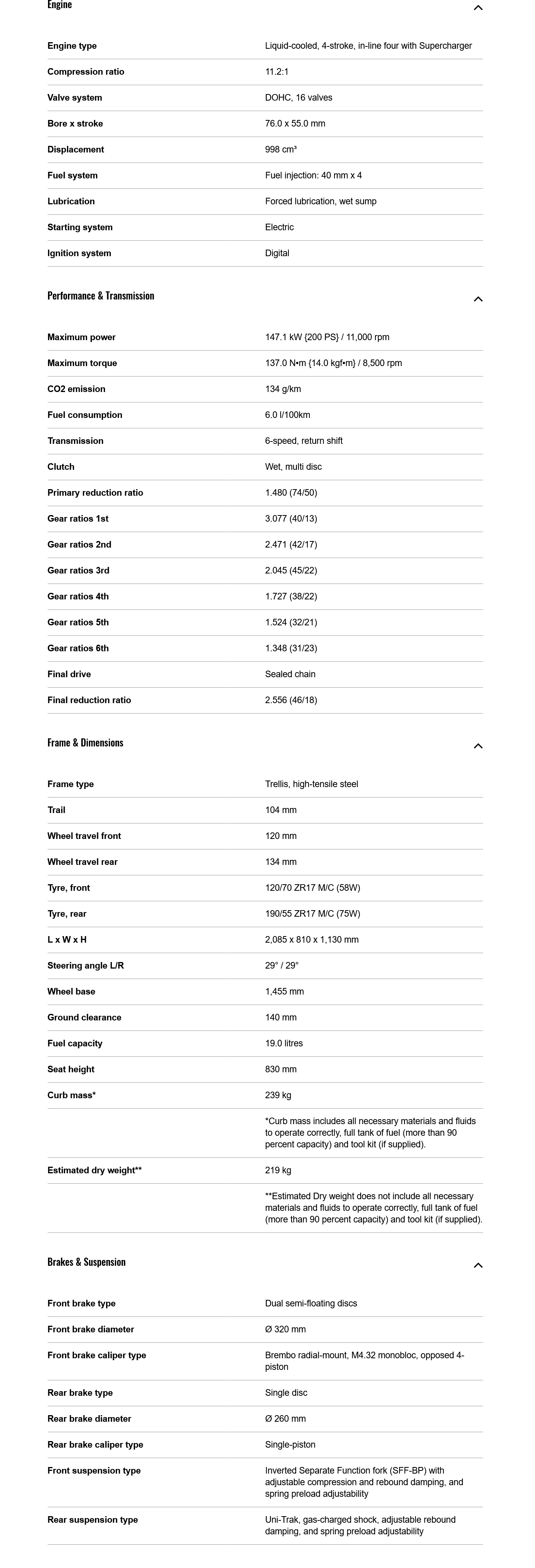 propulsor supraalimentat; sistem KIBS ABS; sistem KQS (Kawasaki Quick Shifter); controlul demararii KLCM; ambreiaj hidraulic Assist & Slipper; controlul tractiunii KTRC; Power Mode; IMU (Inertial Measurement Unit); bord multi-functional cu display TFT color; conectivitate cu smartphone; Cruise control electronic, iluminare cu LED