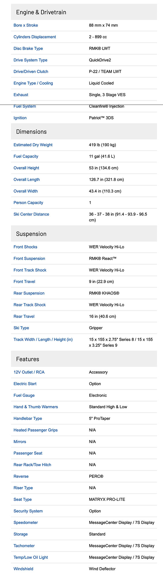 Motor Patriot 9R, Platforma Matryx, Amortizoare Walker Evans Racing Velocity Hi/Low reglabile pe compresie, Senila 15 x 155 x 2.75" Seria 8 / 15 x 155 x 3.25" Seria 9, Distanta dintre schiuri 914 - 939 - 965 mm, schiuri Gripper, Bord digital multifunctional - Display Polaris 7S touchscreen, Faruri LED, Marsarier PERC, spatiu de depozitare, sa Matryx PRO-Lite, manere si acceleratie incalzite, Capacitate 1 persoana