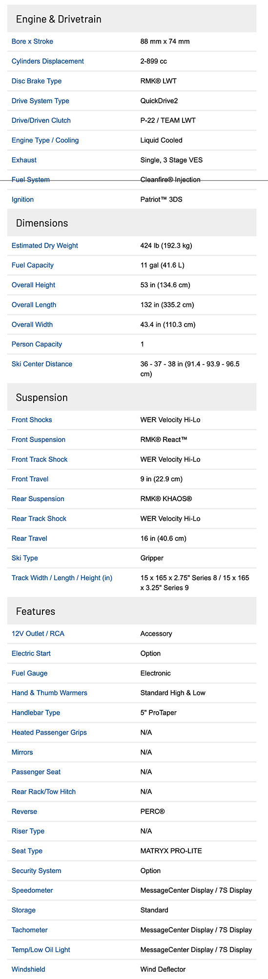 Motor Patriot 9R, Platforma Matryx, Amortizoare Walker Evans Racing Velocity Hi/Low reglabile pe compresie, Senila 15 x 165 x 2.75" Series 8, Distanta dintre schiuri 914 - 939 - 965 mm, schiuri Gripper, Bord digital multifunctional - Display Polaris 7S touchscreen, Faruri LED, Marsarier PERC, spatiu de depozitare, sa Matryx PRO-Lite, manere si acceleratie incalzite, Capacitate 1 persoana, deflector vant