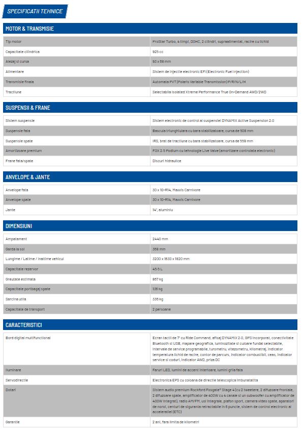 Dotari: Ecran tactil de 7" cu Ride Command, afisaj DYNAMIX 2.0, GPS incorporat, conectivitate Bluetooth si USB, mapare geografica, luminozitate si culoare fundal selectabile, intervale de service programabile, turometru, vitezometru, kilometraj, indicator temperatura lichid de racire, contor de parcurs, indicator combustibil, ceas, indicator service si coduri, indicator AWD, priza DC. Faruri LED, lumini grila fata. Servodirectie Electronica EPS cu coloana de directie telescopica imbunatatita.Sistem audio premium Rockford Fosgate® Stage 4 (cu 2 tweetere, 2 difuzoare frontale, 2 difuzoare spate, amplificator de 400W cu 4 canale si un subwoofer cu amplificator de 400W integrat), radio AM/FM, usi integrale, plafon sport, camera video spate, aparatori de noroi, centuri de siguranta retractabile in 6 puncte, sistem de control electronic al acceleratiei (ETC).