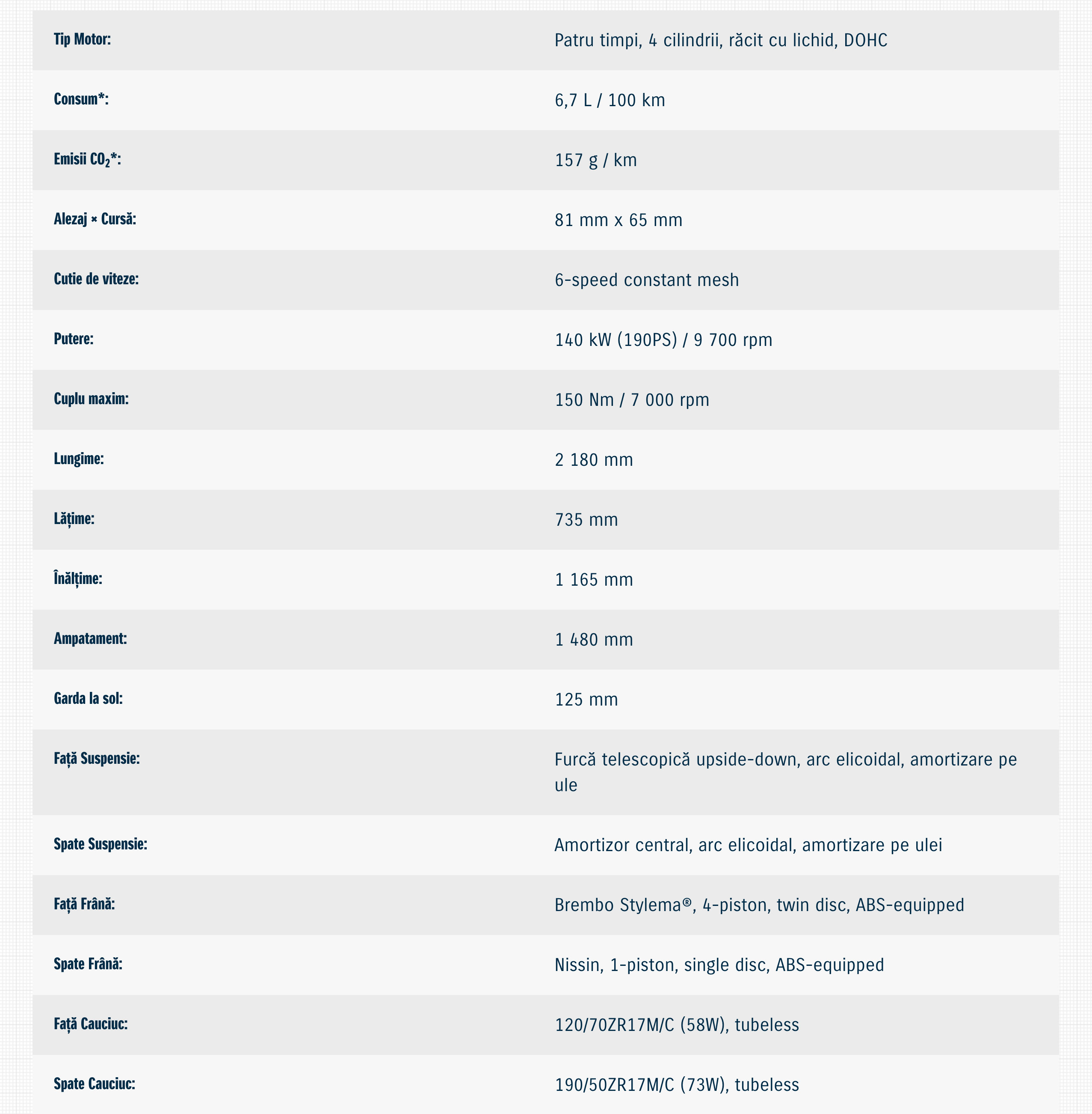 sistem ABS, selector de putere, sistem de control anti-ridicare al rotii fata, sistem de control al tractiunii, sistem quick-shift bi-directional, sistem de control al franei de motor, sistem de control al pantei / rampei, sistem de control al demarajului, sistem de control Hill Hold, sistem de control viteza de croaziera, etriere frana fata Brembo Stylema, suspensie optimizata, anvelope Bridgestone BATTLAX HYPERSPORT S22, instrumentar de bord cu display LCD TFT, far LED, baterie ELIIY Power Litiu-Ion