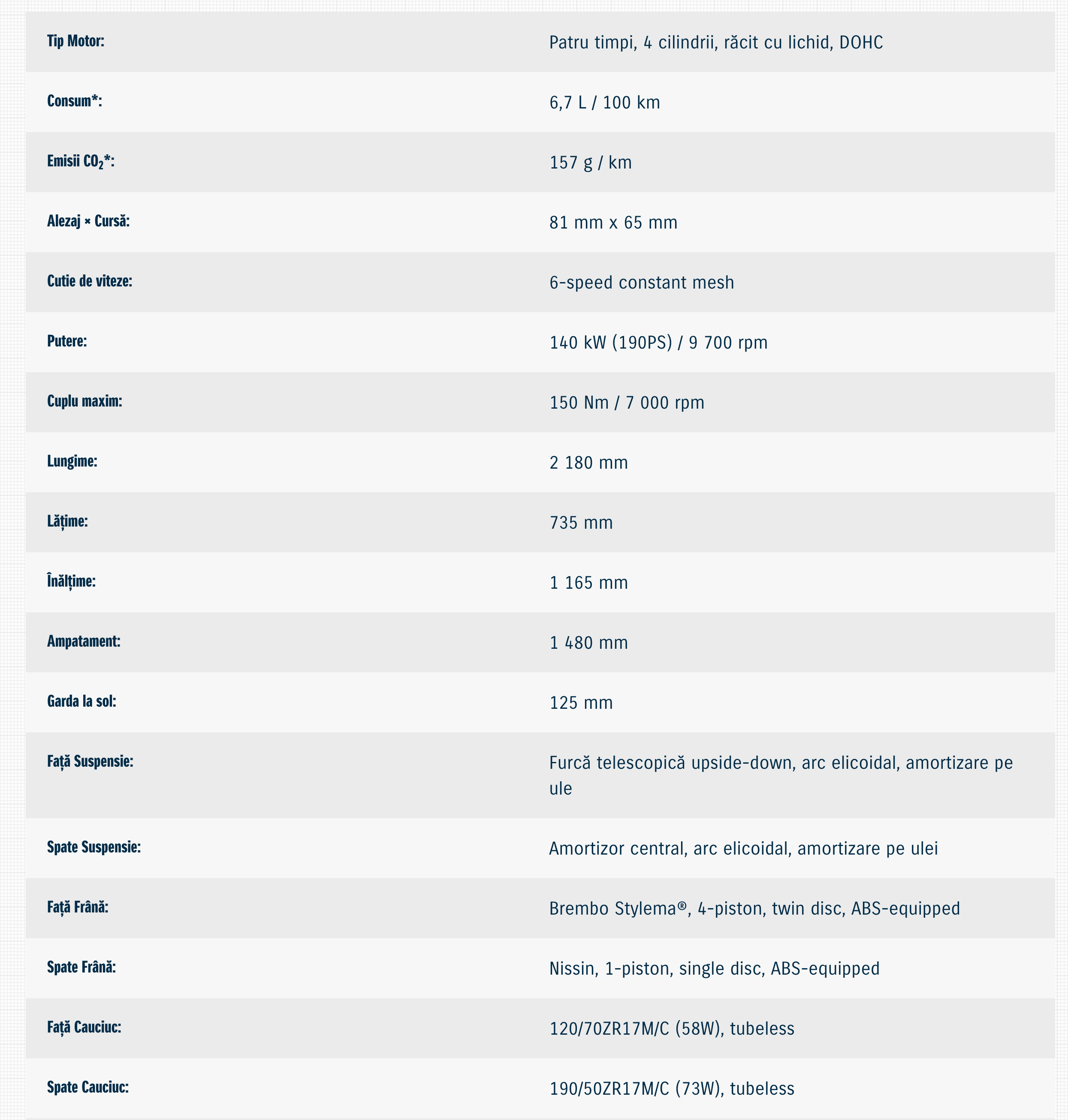 sistem ABS, selector de putere, sistem de control anti-ridicare al rotii fata, sistem de control al tractiunii, sistem quick-shift bi-directional, sistem de control al franei de motor, sistem de control al pantei / rampei, sistem de control al demarajului, sistem Hill Hold, sistem de control viteza de croaziera, etriere frana fata Brembo Stylema, suspensie optimizata, anvelope Bridgestone BATTLAX HYPERSPORT S22, instrumentar de bord cu display LCD TFT, far LED