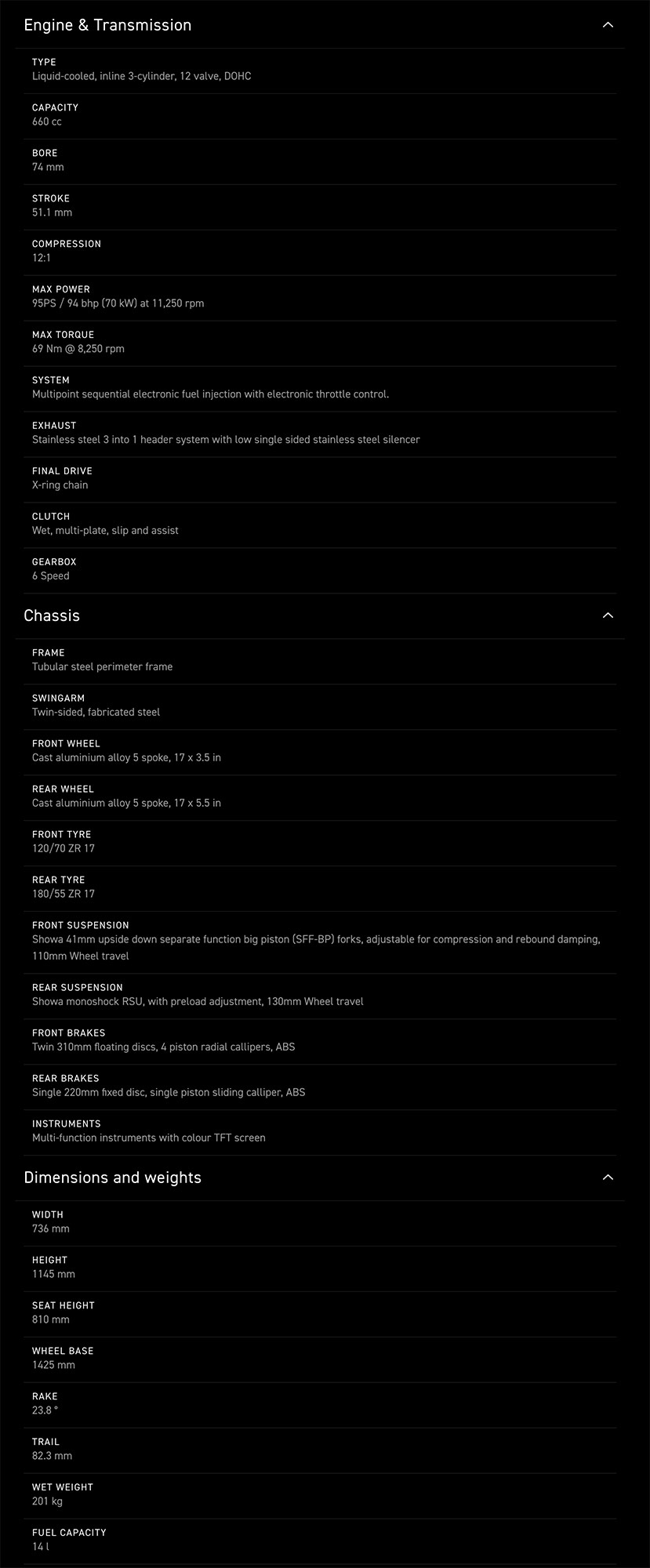 sistem ABS, suspensii Showa, acceleratie Ride-by-Wire, Slip & assist clutch, trei moduri de pilotaj (Sport, Road, Rain), control al tractiunii decuplabil, sistem de siguranță Emergency Deceleration Warning, bord multifunctional LCD cu display TFT integrat, sistem de lumini full LED, anvelope Metzeler M9RR