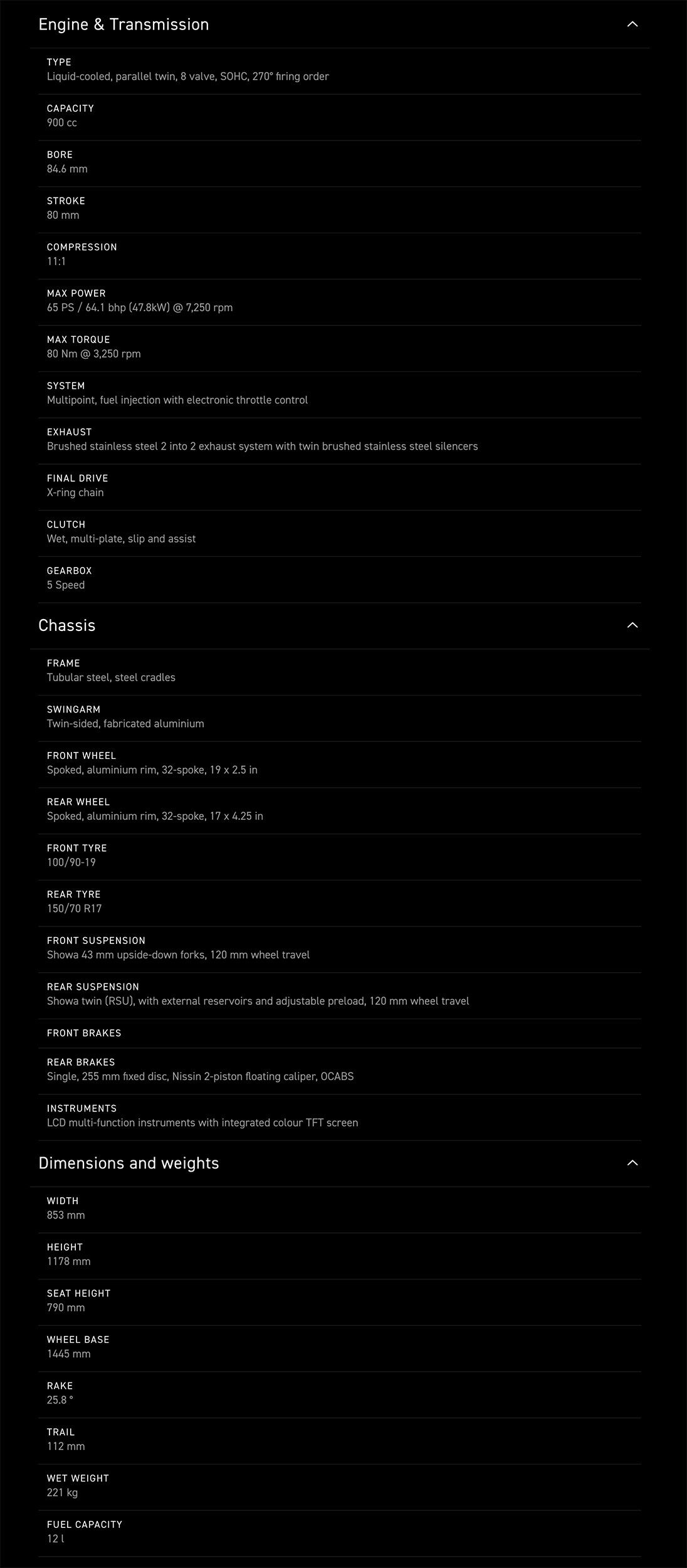 Optimised Cornering ABS, TTC (Triumph Traction Control), Ride-by-wire, ambreiaj torque-assist, sistem de franare fata Brembo, trei moduri de pilotaj (Road, Rain, Off-Road), suspensie ajustabila, iluminare cu LED, priza USB-C, Bord LCD multifunctional cu insertie TFT color, conectivitate Bluetooth, swingarm aluminiu