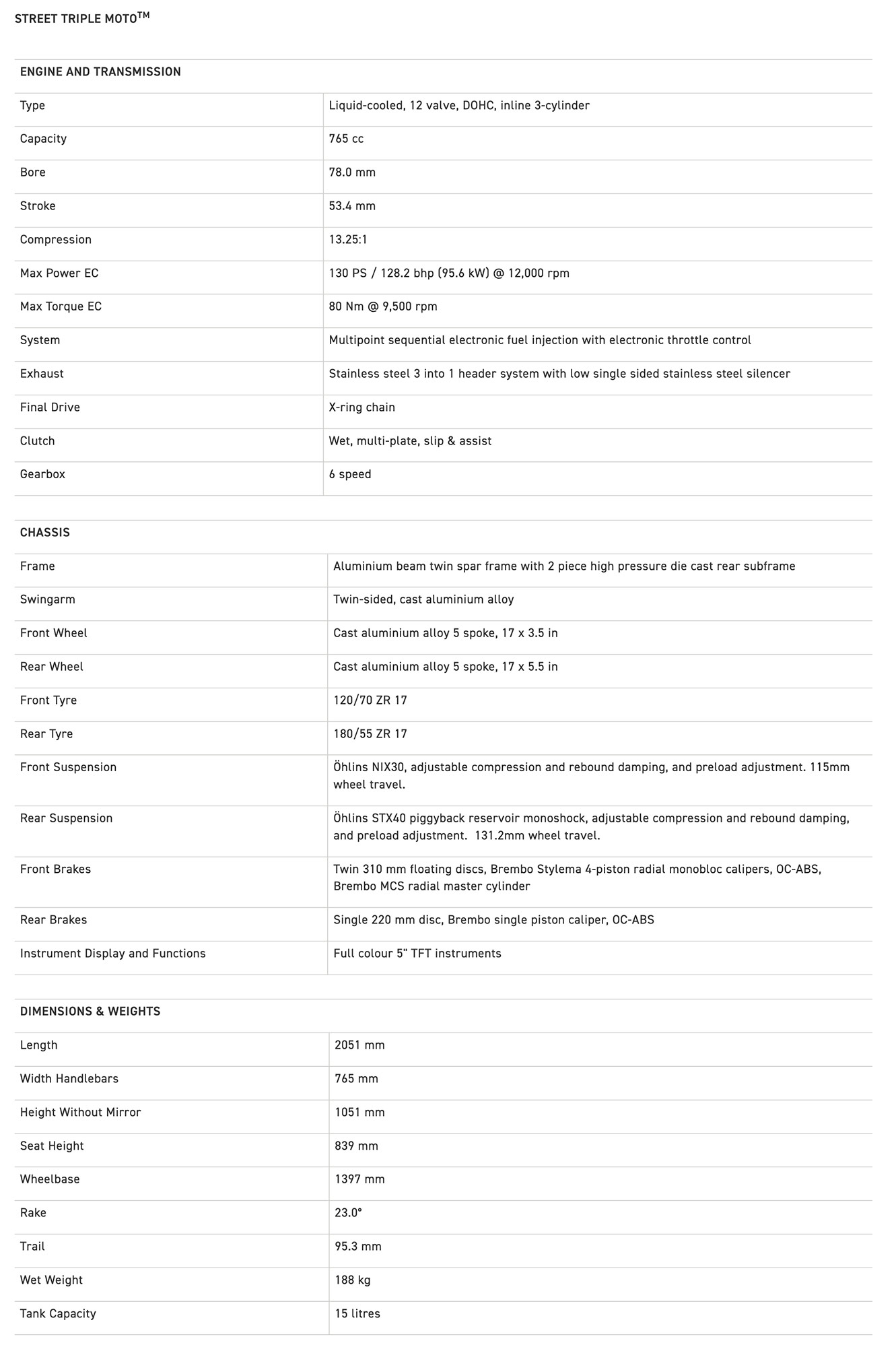 Triumph Street Triple Moto2 Edition este o celebrare exclusivă a parteneriatului Triumph cu clasa Moto2, concepută pentru entuziaÈ™tii curselor È™i colecÈ›ionari. La baza ei stă un motor in-linie triplu de 765 cc, răcit cu lichid, cu 12 supape È™i DOHC, dar optimizat pentru performanță: dezvoltă până la 130 CP (95,6 kW) la 12.000 rpm È™i un cuplu de 80 Nm la 9.500 rpm, ceea ce asigură acceleraÈ›ii explozive È™i o sensibilitate ridicată în plaje mari de turaÈ›ii. Sistemul de injecÈ›ie secvenÈ›ială È™i ambreiajul multi-placă conferă control maxim, iar cutia de viteze în 6 trepte este echipată cu Shift Assist pentru schimbări rapide È™i precise. Profunzimea racing continuă pe partea de È™asiu: cadrul este  twin-spar al­uminiu, iar suspensiile sunt  Öhlins: furcă NIX30 reglabilă È™i amortizor STX40 cu rezervor piggy-back, ambele reglabile pe compresie, rebound È™i preîrcărcare, cu o cursă de 115 mm față È™i 131,2 mm spate. Sistemul de frânare este de nivel înalt, cu două discuri de 310 mm È™i etriere Brembo Stylema radiale pe față È™i disc de 220 mm la spate, susÈ›inut de ABS orientat pe viraje (cornering ABS). Bordul este un display TFT color de 5 inchi, cu ecran de start personalizat Moto2, iar fiecare unitate este numerotată pe yoke-ul superior, subliniind caracterul de serie limitată. Estetic, Moto2 Edition impresionează prin panouri laterale, aripă față È™i protecÈ›ii realizate din fibră de carbon, un sub-cadru galben Triumph Performance Yellow È™i o È™a brodată cu logo-ul Moto2. Acest model nu este doar o motocicletă de stradă – este o piesă de colecÈ›ie cu pedigree de curse, ideală pentru cei care vor performanță autentică È™i design inspirat de motorsport.