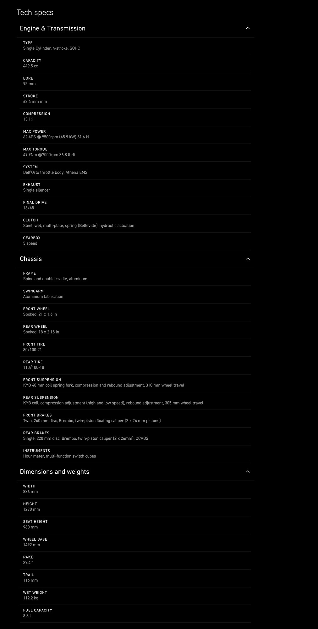 Motor monocilindric 450cc, sistem de injecție Dell’Orto, valve titan DelWest, suspensii KYB, acceleratie Dell’Orto 44mm, protectii maini enduro, 3 harti motor, etriere Brembo pe discuri Galfe, ghidon ProTaper Evo MX, ambreiaj Exedy