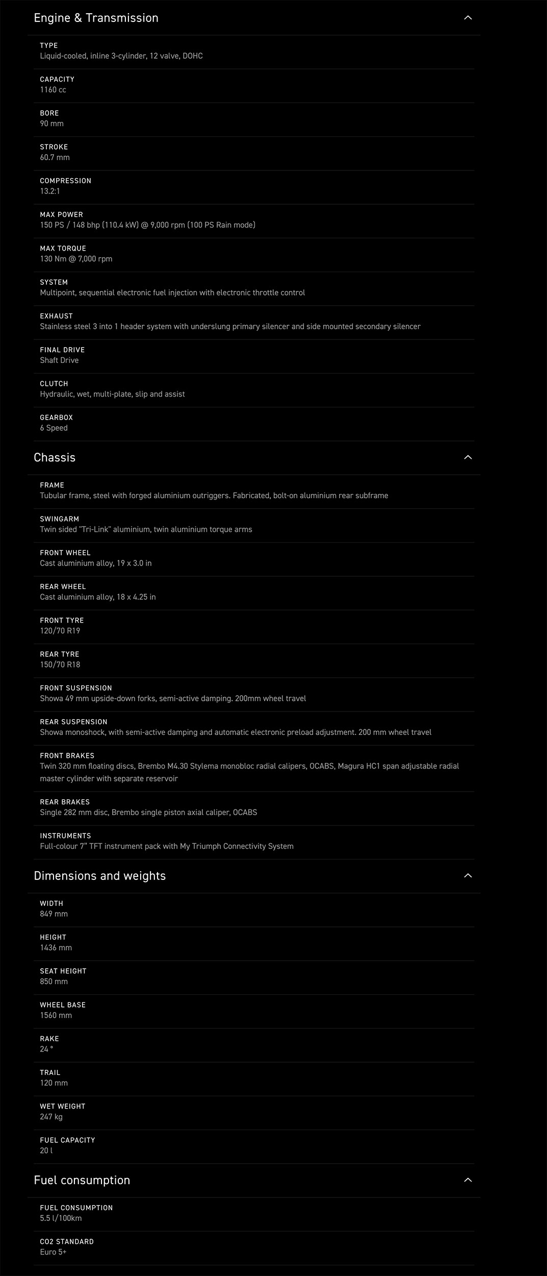 motor cu tehnologie T-Plane, Blind Spot Assist, Lane Change Assist, manere si sa incalzite, suspensii Showa semi-active, display TFT 7 inch cu conectivitate smartphone, Tri-link swingarm, Triumph Shift Assist, protectii maini, parbriz ajustabil, 5 moduri condus - Road, Rain, Sport, Off-Road, Rider Configurable; pornire keyless, faruri LED cu DRL