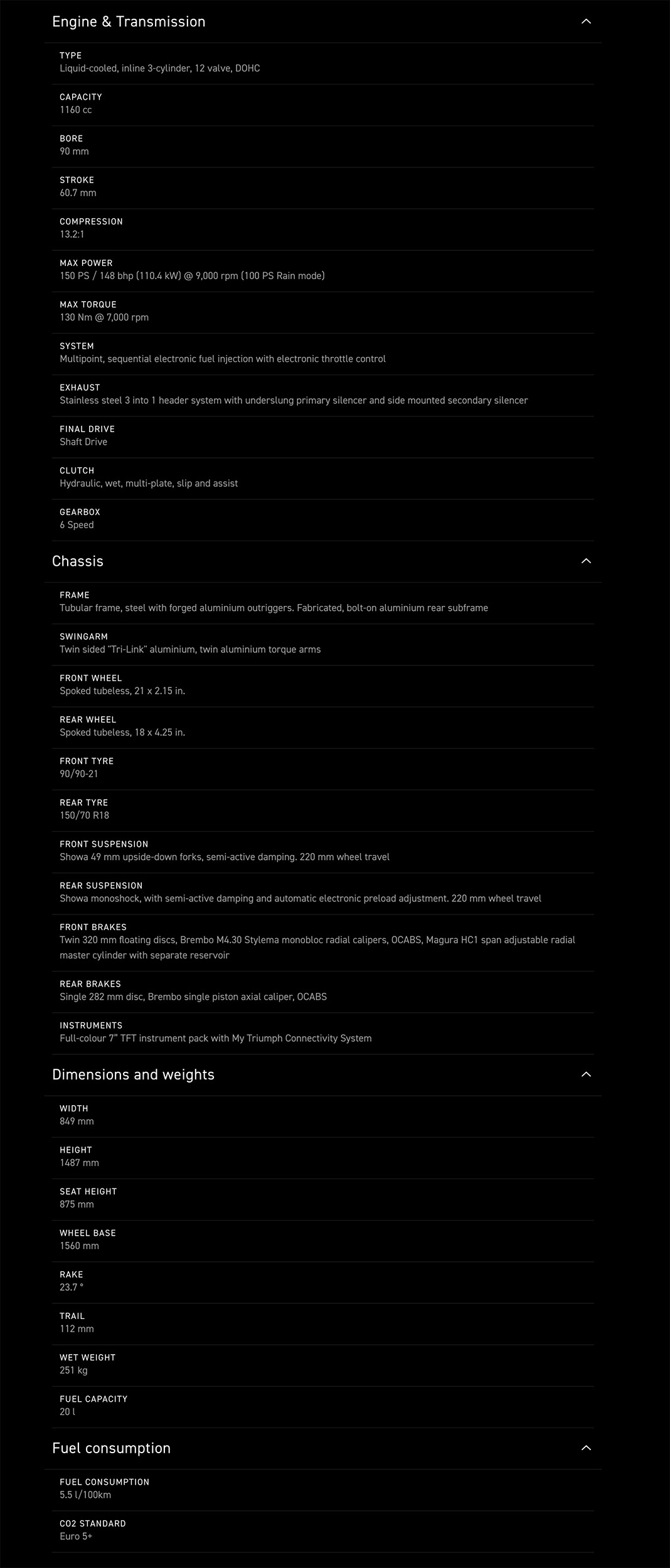 motor cu tehnologie T-Plane, Blind Spot Assist, Lane Change Assist, suspensii Showa semi-active, display TFT 7 inch cu conectivitate smartphone, Tri-link swingarm, Triumph Shift Assist, protectii maini, parbriz ajustabil, 6 moduri condus - Road, Rain, Sport, Rider Configurable, Off-Road, si Off-Road Pro; pornire keyless, faruri LED cu DRL