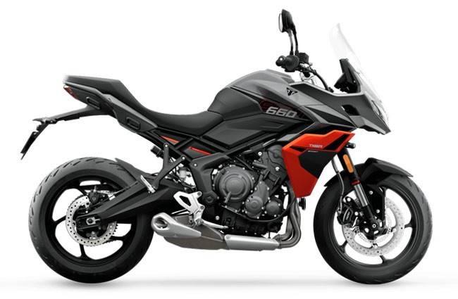 Triumph Tiger Sport 660 este motocicleta sport-tourer care îmbină agilitatea excelentă pe drumurile urbane cu confortul necesar pentru aventuri de distanță, oferind o experiență de condus versatilă și captivantă pentru motocicliștii moderni. Modelul actual primește cele mai semnificative îmbunătățiri de până acum, începând cu un motor triple de 660 cm³ cu performanțe superioare: puterea este acum semnificativ crescută la 95 CP și cuplul maxim de 68 Nm, oferind o livrare mai lină a puterii și o plajă de turații extinsă care stimulează accelerațiile și flexibilitatea în trafic sau pe autostradă. Noul rezervor cu capacitate mărită la peste 18 litri sporește autonomia, iar carenele și capota radiatorului redesenate oferă protecție, aerodinamică superioară și un look dinamic, sporind în același timp confortul la viteze mari. În continuare, șasiul cu cadru tubular din oțel și suspensia cu furcă inversată Showa de 41 mm și amortizor monoshock asigură echilibrul între stabilitate și manevrabilitate, în timp ce greutatea redusă și poziția naturală de pilotaj fac motocicleta ușor de controlat în orice situație. Tehnologia de bord include un afișaj TFT color ușor de citit și multiple moduri de rulare adaptate la condițiile de drum, iar sistemele moderne de siguranță cum ar fi ABS optimizat pentru viraje și controlul tracțiunii ajustabil completează pachetul sport-tourer. Cu motorul cu trei cilindri, cutie de viteze cu 6 trepte și transmisie pe lanț X-ring, roți de 17” cu anvelope 120/70 R17 față și 180/55 R17 spate, suspensii Showa și frâne Nissin cu discuri duble față de Ø310 mm și disc spate de Ø255 mm, Tiger Sport 660 rămâne o opțiune de top pentru cei care caută performanță, confort și versatilitate într-un pachet compact și atrăgător.