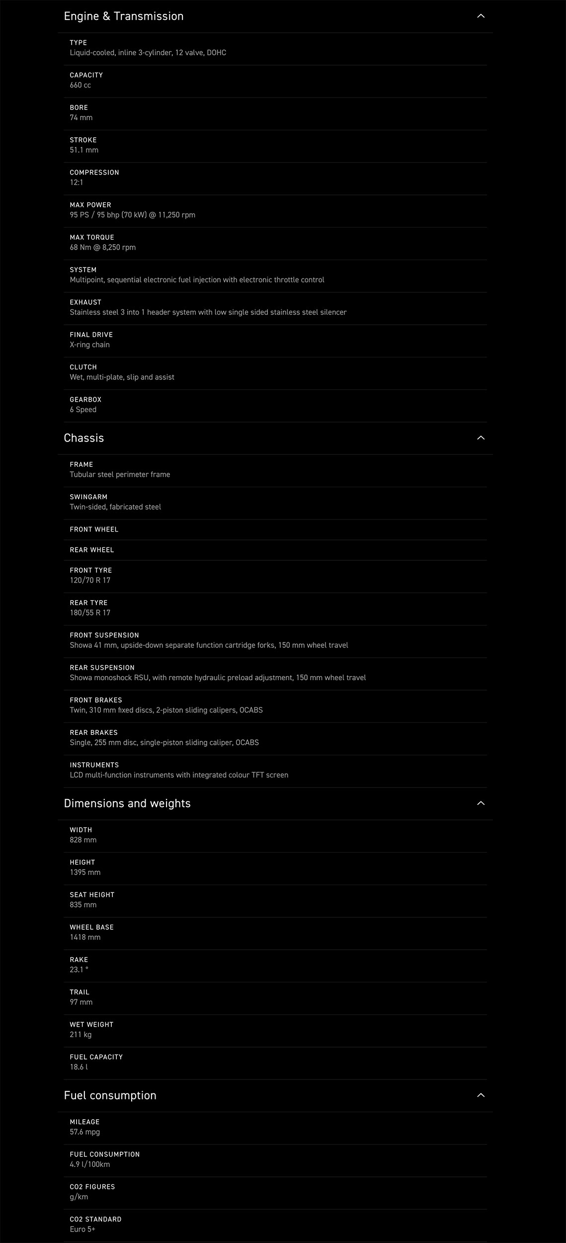 accelerație ride-by-wire, ambreiaj Slip-Assist, controlul tracțiunii, cruise control, Moduri conducere: Road, Rain, Sport selectabile, sistem de frânare Nissin, suspensii Showa, parbriz reglabil, bord multi-functional cu afisaj TFT color si conectivitate cu smartphone-ul (My Triumph Connectivity), iluminare LED cu DRL, cruise control, ABS optimizat pentru viraje, quickshifter, anvelope Michelin Road 5