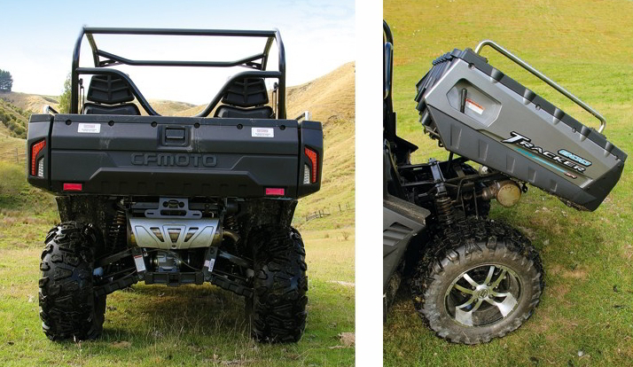 Utilitatea lui Tracker 800 este completata de bena spate basculabila, troliul electric de 3500 lbs (1587 kg), anvelopele cu profil off-road pe 14 inch si bila pentru remorca. Toate acestea, impreuna cu puterea motorului V-Twin si manevrabilitatea superioara fac din CF Moto Tracker 800 un vehicul foarte util la muncile din jurul gospodariei. Ca si accesorii optionale, CF Moto va pune la dispozitie parbriz fata, geam spate, acoperis, scuturi protectie, protectii pentru brate, etc.