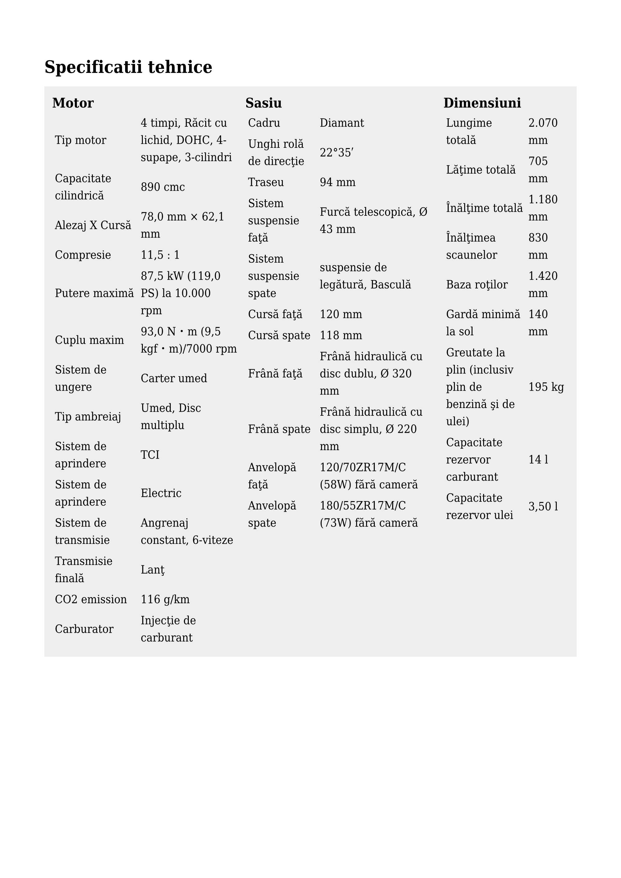 Motor CP3, 890cmc, cadru Deltabox aluminiu, sistem de franare Brembo Stylema, Suspensie KYB, moduri de putere, control al demararii si ridicarii, afisaj TFT 5 inch cu conectivitate smartphone, sistem rapid de schimbare a vitezelor (QSS) din a treia generatie, control al franei de motor și regulator de alunecare spate, caroserie aerodinamica agresiva cu aripioare pentru forta de apasare, moduri conducere: Sport, Street, Rain + 2 moduri personalizabile si 4 moduri Pista